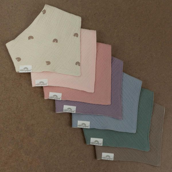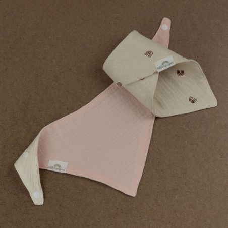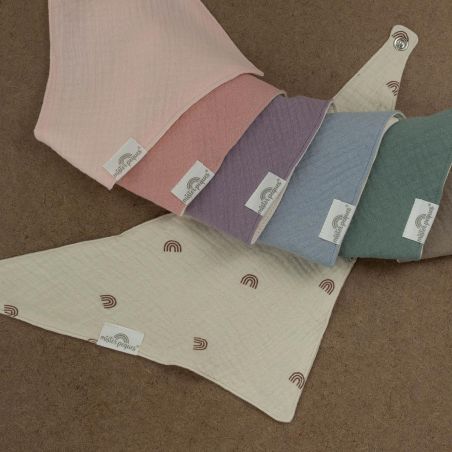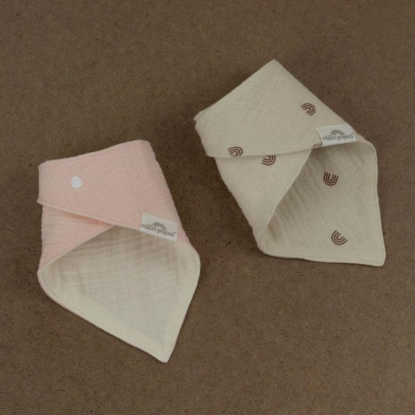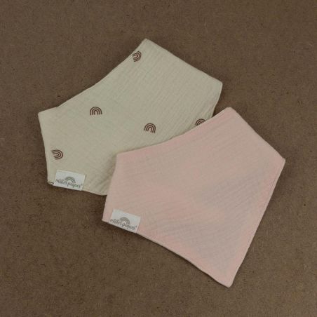 PACK DE 2 BABEROS BANDANA REVERSIBLES COLOR ARCOIRIS & ROSA, fabricados con tejido de muselina de doble capa compuesto por 100% algodón orgánico. Reversibles, muy suaves y absorbentes.