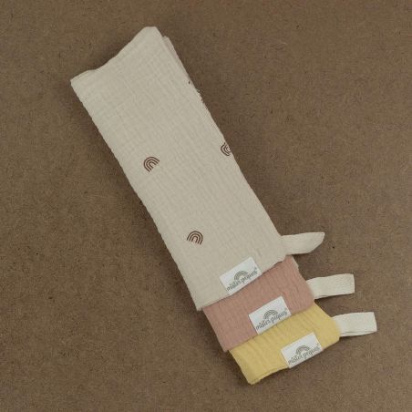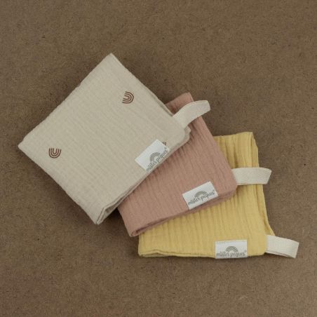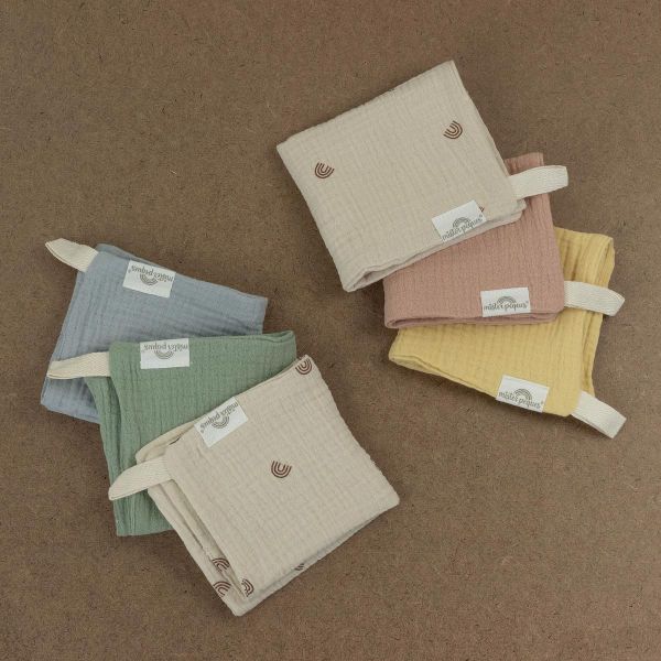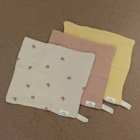PACK DE 3 TOALLITAS TAMAÑO 21x21cm COLOR ARCOIRIS CÁLIDO, fabricadas con tejido de muselina de doble capa compuesto por 100% algodón orgánico. Versátiles, muy suaves y absorbentes.